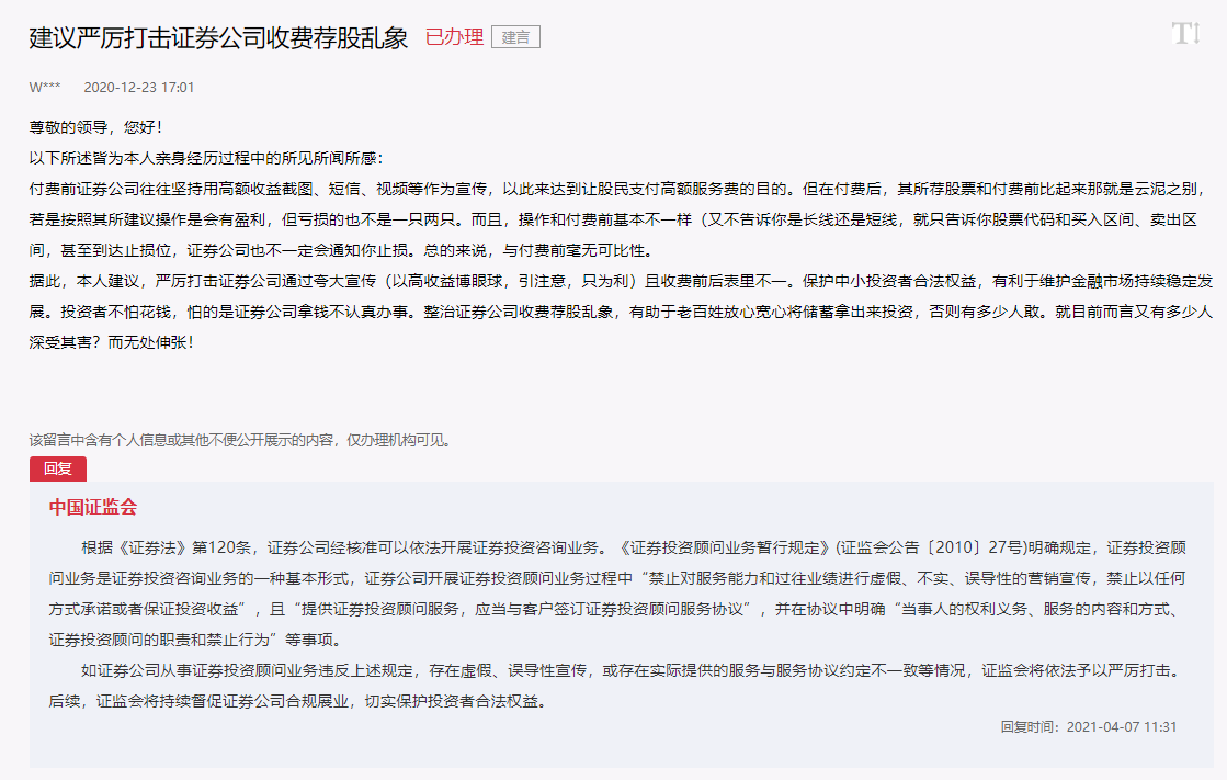 “希望打击证券公司收费荐股乱象”“提高上市公司中介机构质量”“对造假的上市公司严格执行退市制度”……最近,有网民通过“领导留言板”为资本市场发展建言献策。4月7日,中国证券监督管理委员会对这些共性问题进行公开回复,300多字的回复中,中国证券监督管理委员会认真复盘网民所指问题背后的复杂成因,表示将督促证券公司合规展业,强化退市监管力度,切实保护投资者合法权益。